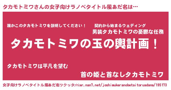 | 男性向けラノベタイトル風あだ名 | 『転生したらタカモトミワだった件』 |