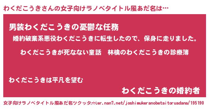| 男性向けラノベタイトル風あだ名 | 『魔弾の王とわくだこうき』 |