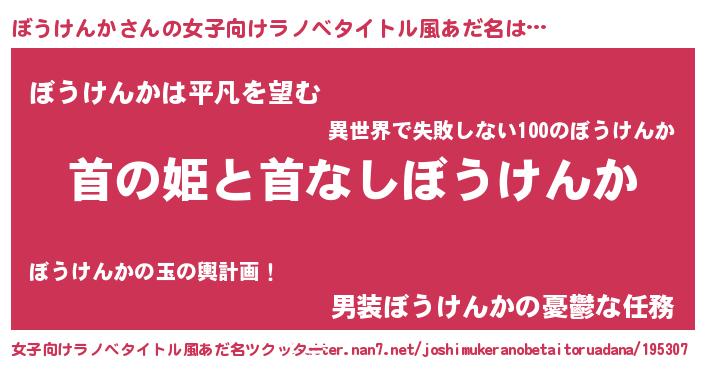 | 男性向けラノベタイトル風あだ名 | 『はたらくぼうけんかさま!』 |