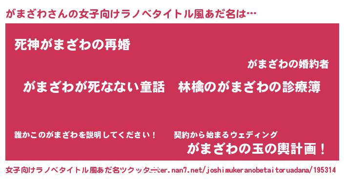 がまざわさんの女子向けラノベタイトル風あだ名は… 『がまざわが死なない童話 林檎のがまざわの診療簿』『死神がまざわの再婚』『がまざわの玉の輿計画!』 ツクッター #女子向けラノベタイトル風あだ名ツクッター http://tkutter.nan7.net/joshimukeranobetaitoruadana/195314/