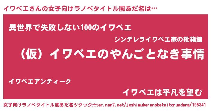 イワベエさんの女子向けラノベタイトル風あだ名は… 『(仮)イワベエのやんごとなき事情』『異世界で失敗しない100のイワベエ』『イワベエは平凡を望む』 ツクッター #女子向けラノベタイトル風あだ名ツクッター http://tkutter.nan7.net/joshimukeranobetaitoruadana/195341/