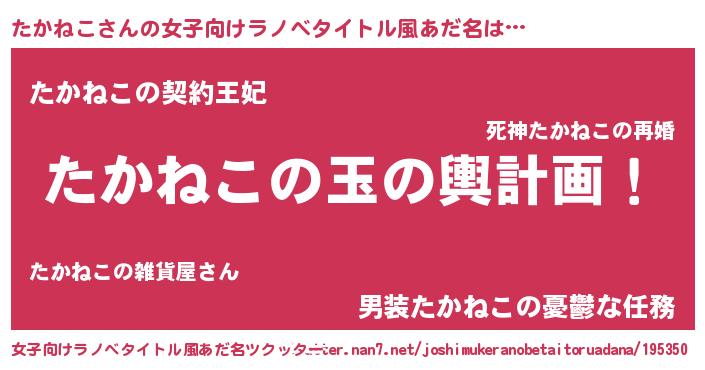 | 男性向けラノベタイトル風あだ名 | 『たかねこ~年齢イコール彼女いない歴の魔法使い~』 |