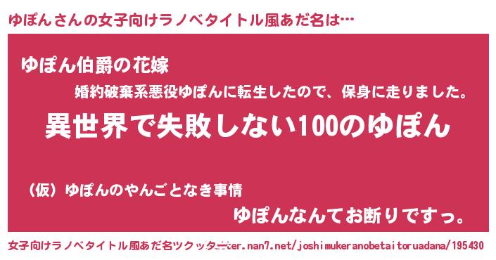 | 男性向けラノベタイトル風あだ名 | 『ゆぽんという概念が存在しない退屈な世界 』 |