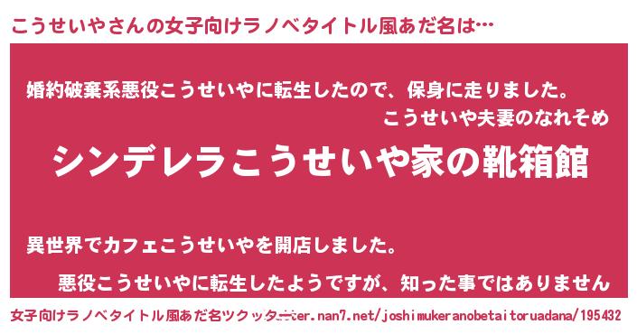 | 男性向けラノベタイトル風あだ名 | 『冴えないこうせいやの育てかた』 |