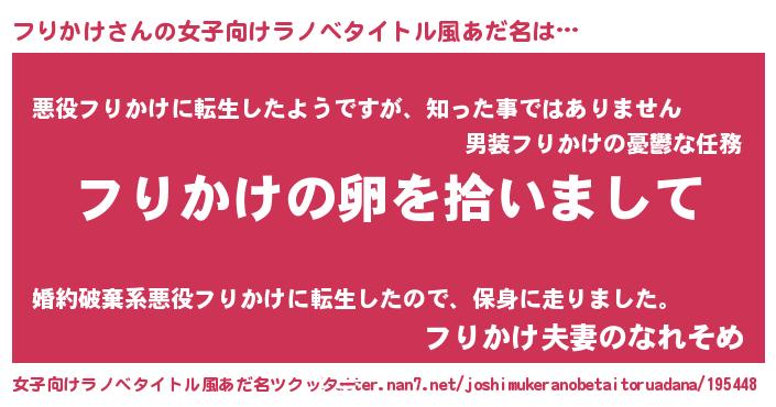 | 男性向けラノベタイトル風あだ名 | 『フりかけの嫁は女の子じゃないと思った?』 |