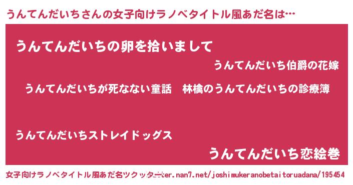 うんてんだいちさんの女子向けラノベタイトル風あだ名は… 『うんてんだいちが死なない童話 林檎のうんてんだいちの診療簿』『うんてんだいちの卵を拾いまして』『うんてんだいち恋絵巻』 ツクッター #女子向けラノベタイトル風あだ名ツクッター http://tkutter.nan7.net/joshimukeranobetaitoruadana/195454/