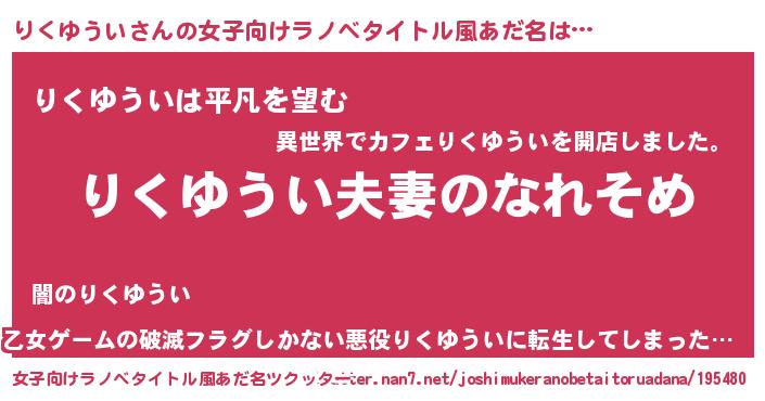 | 男性向けラノベタイトル風あだ名 | 『おまえをオタクにしてやるから、俺をりくゆういにしてくれ! 』 |