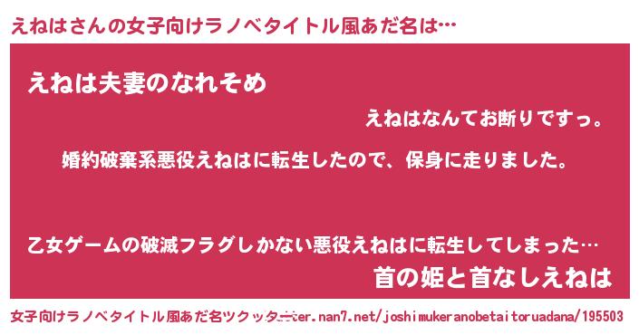 | 男性向けラノベタイトル風あだ名 | 『エネハスレイヤー』『魔弾の王とえねは』 |