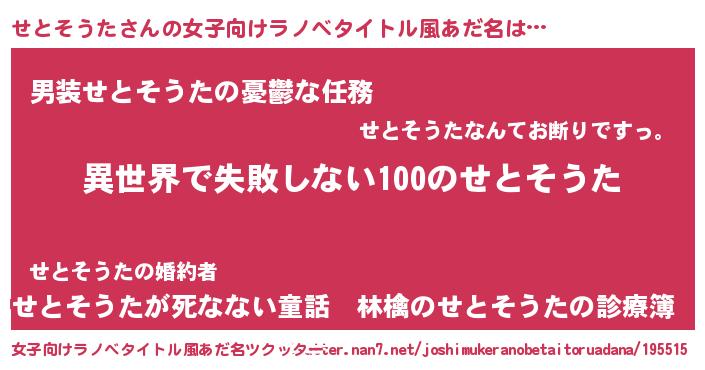| 男性向けラノベタイトル風あだ名 | 『せとそうたという概念が存在しない退屈な世界 』 |