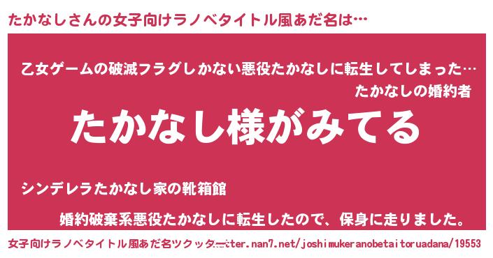 | 男性向けラノベタイトル風あだ名 | 『たかなしの嫁は女の子じゃないと思った?』 |