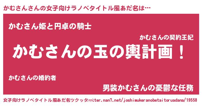 | 男性向けラノベタイトル風あだ名 | 『かむさん~年齢イコール彼女いない歴の魔法使い~』 |