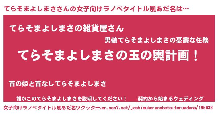 | 男性向けラノベタイトル風あだ名 | 『てらそまよしまさ~年齢イコール彼女いない歴の魔法使い~』 |