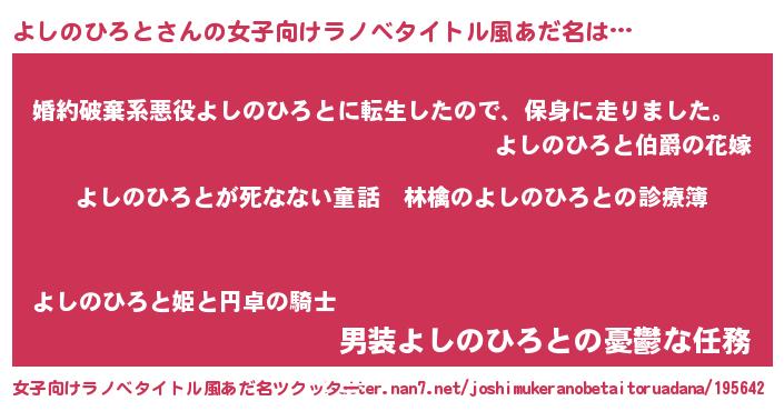 よしのひろとさんの女子向けラノベタイトル風あだ名は… 『よしのひろとが死なない童話 林檎のよしのひろとの診療簿』『婚約破棄系悪役よしのひろとに転生したので、保身に走りました。』『男装よしのひろとの憂鬱な任務』 ツクッター #女子向けラノベタイトル風あだ名ツクッター http://tkutter.nan7.net/joshimukeranobetaitoruadana/195642/