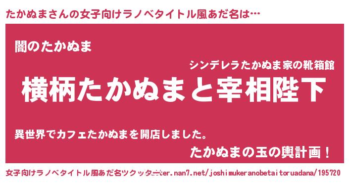 | 男性向けラノベタイトル風あだ名 | 『たかぬまに滅ぼされるだけの簡単なお仕事です』 |