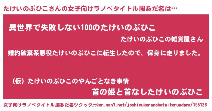 | 男性向けラノベタイトル風あだ名 | 『タケイノブヒコスレイヤー』 |
