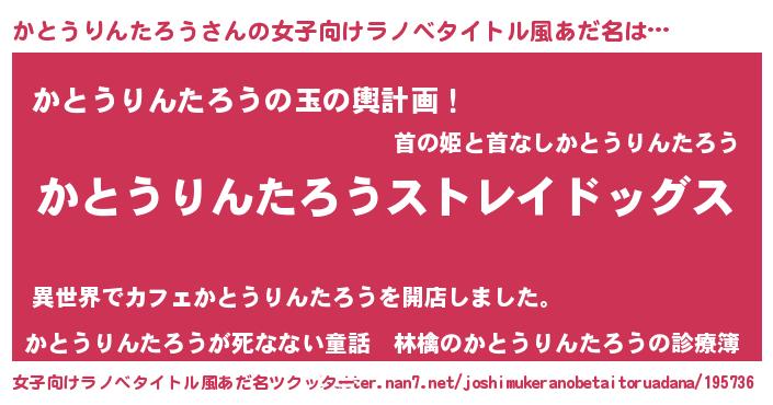 | 男性向けラノベタイトル風あだ名 | 『Re:かとうりんたろうから始める異世界生活』 |