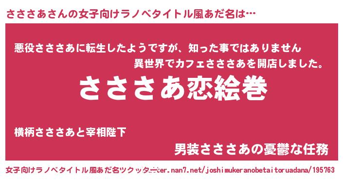 | 男性向けラノベタイトル風あだ名 | 『おまえをオタクにしてやるから、俺をさささあにしてくれ! 』 |