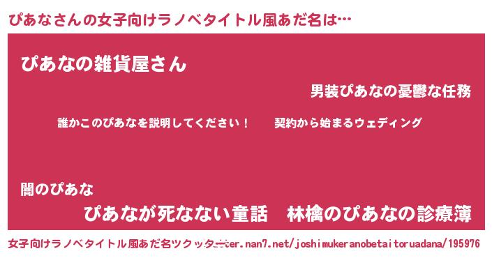 ぴあなさんの女子向けラノベタイトル風あだ名は… 『誰かこのぴあなを説明してください! ~契約から始まるウェディング~』『ぴあなの雑貨屋さん』『ぴあなが死なない童話 林檎のぴあなの診療簿』 ツクッター #女子向けラノベタイトル風あだ名ツクッター http://tkutter.nan7.net/joshimukeranobetaitoruadana/195976/