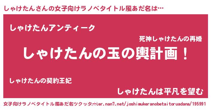 | 男性向けラノベタイトル風あだ名 | 『しゃけたん~年齢イコール彼女いない歴の魔法使い~』 |