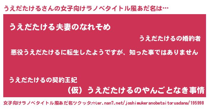 | 男性向けラノベタイトル風あだ名 | 『この素晴らしい世界にうえだたけるを!』 |