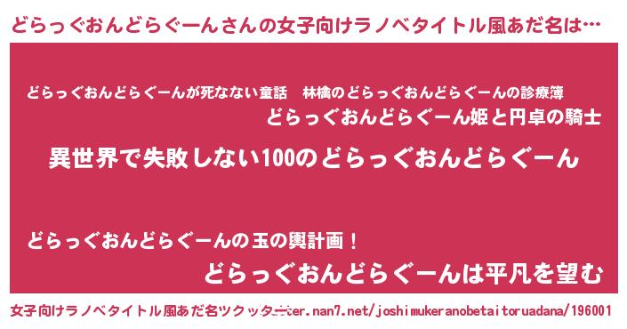 | 男性向けラノベタイトル風あだ名 | 『どらっぐおんどらぐーんという概念が存在しない退屈な世界 』 |