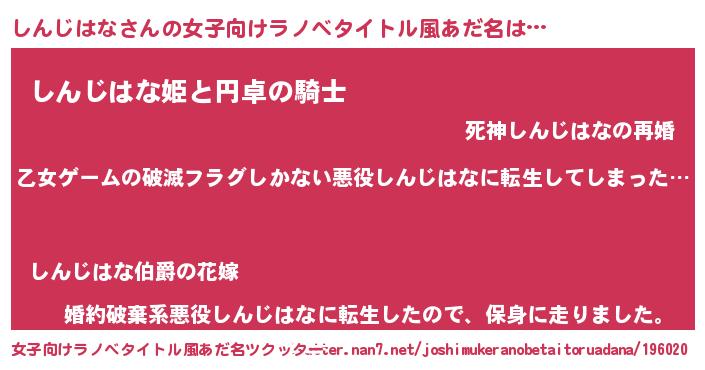 | 男性向けラノベタイトル風あだ名 | 『この素晴らしい世界にしんじはなを!』 |