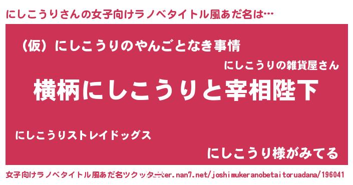| 男性向けラノベタイトル風あだ名 | 『にしこうりに滅ぼされるだけの簡単なお仕事です』 |