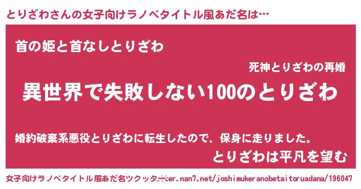とりざわさんの女子向けラノベタイトル風あだ名は… 『異世界で失敗しない100のとりざわ』『首の姫と首なしとりざわ』『とりざわは平凡を望む』 ツクッター #女子向けラノベタイトル風あだ名ツクッター http://tkutter.nan7.net/joshimukeranobetaitoruadana/196047/