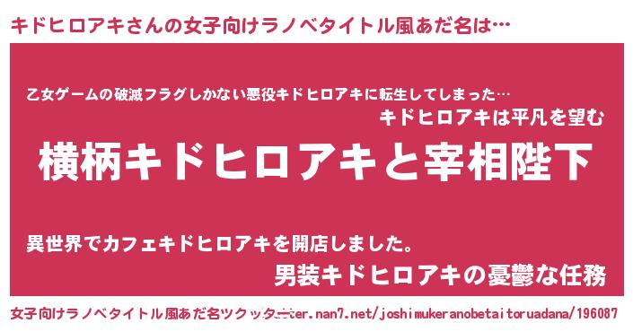 | 男性向けラノベタイトル風あだ名 | 『キドヒロアキに滅ぼされるだけの簡単なお仕事です』 |