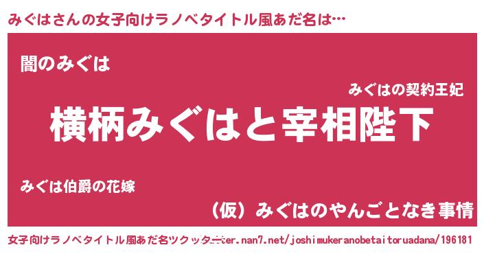 みぐはさんの女子向けラノベタイトル風あだ名は… 『横柄みぐはと宰相陛下』『闇のみぐは』『(仮)みぐはのやんごとなき事情』 ツクッター #女子向けラノベタイトル風あだ名ツクッター http://tkutter.nan7.net/joshimukeranobetaitoruadana/196181/