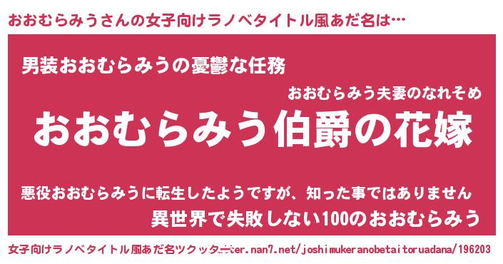 | 男性向けラノベタイトル風あだ名 | 『うちの娘の為ならば、俺はもしかしたらおおむらみうも倒せるかもしれない。』 |