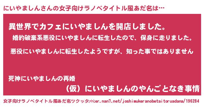 | 男性向けラノベタイトル風あだ名 | 『この素晴らしい世界ににいやましんを!』 |