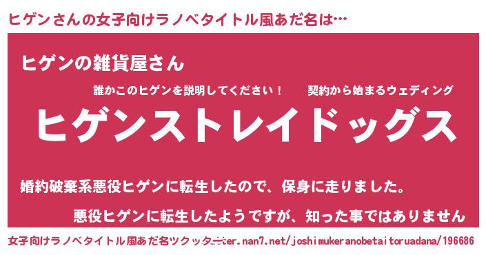 | 男性向けラノベタイトル風あだ名 | 『Re:ヒゲンから始める異世界生活』 |