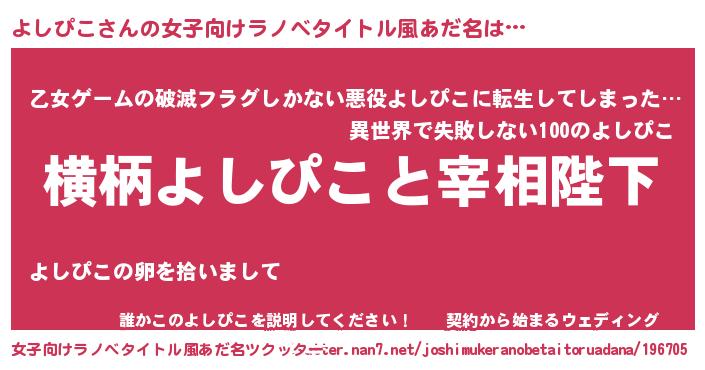 | 男性向けラノベタイトル風あだ名 | 『よしぴこに滅ぼされるだけの簡単なお仕事です』 |