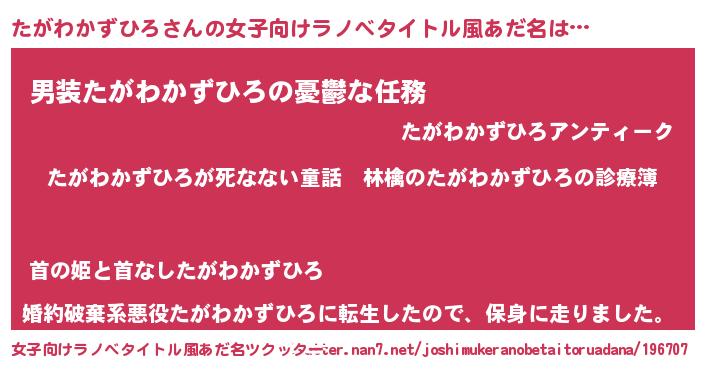 | 男性向けラノベタイトル風あだ名 | 『魔弾の王とたがわかずひろ』 |