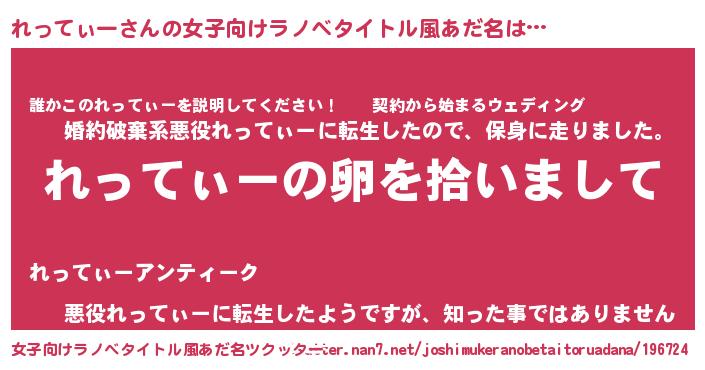 | 男性向けラノベタイトル風あだ名 | 『ダンジョンにれってぃーを求めるのは間違っているだろうか』 |