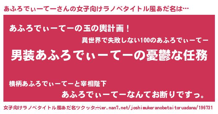 | 男性向けラノベタイトル風あだ名 | 『うちのあふろでぃーてーが世界を掌握している!』 |