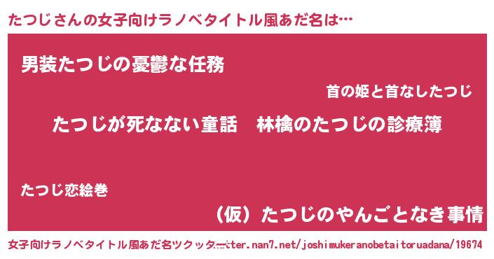 | 男性向けラノベタイトル風あだ名 | 『魔弾の王とたつじ』『たつじの憂鬱』 |