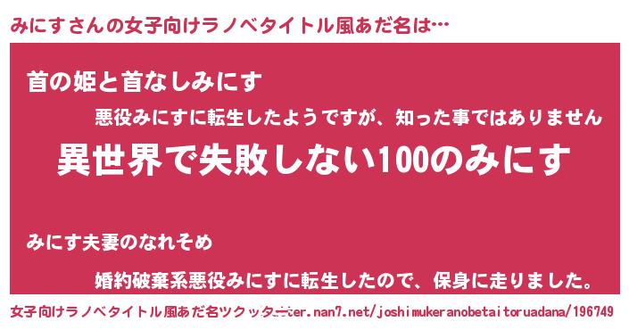 | 男性向けラノベタイトル風あだ名 | 『みにすという概念が存在しない退屈な世界 』 |