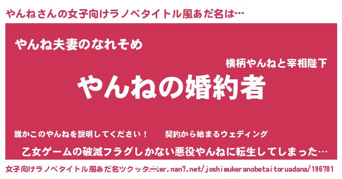 やんねさんの女子向けラノベタイトル風あだ名は… 『やんねの婚約者』『やんね夫妻のなれそめ』『乙女ゲームの破滅フラグしかない悪役やんねに転生してしまった…』 ツクッター #女子向けラノベタイトル風あだ名ツクッター http://tkutter.nan7.net/joshimukeranobetaitoruadana/196781/