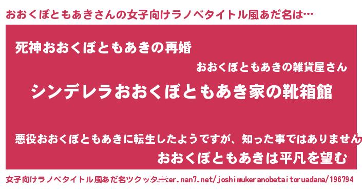 | 男性向けラノベタイトル風あだ名 | 『冴えないおおくぼともあきの育てかた』 |