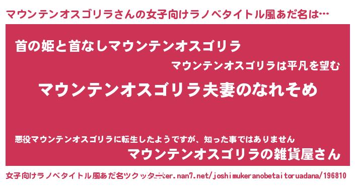| 男性向けラノベタイトル風あだ名 | 『おまえをオタクにしてやるから、俺をマウンテンオスゴリラにしてくれ! 』 |