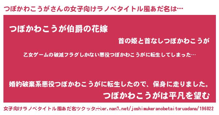 | 男性向けラノベタイトル風あだ名 | 『魔弾の王とつぼかわこうが』 |
