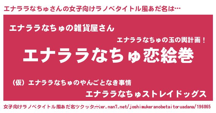 | 男性向けラノベタイトル風あだ名 | 『おまえをオタクにしてやるから、俺をエナララなちゅにしてくれ! 』 |