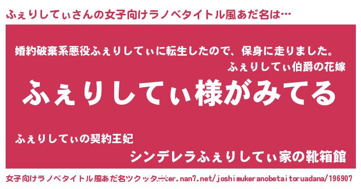 | 男性向けラノベタイトル風あだ名 | 『ふぇりしてぃの嫁は女の子じゃないと思った?』 |