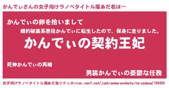 かんでぃさんの女子向けラノベタイトル風あだ名は… 『かんでぃの契約王妃』『かんでぃの卵を拾いまして』『男装かんでぃの憂鬱な任務』 ツクッター #女子向けラノベタイトル風あだ名ツクッター http://tkutter.nan7.net/joshimukeranobetaitoruadana/196935/