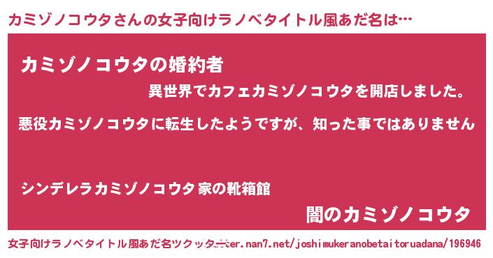 | 男性向けラノベタイトル風あだ名 | 『この素晴らしい世界にカミゾノコウタを!』 |