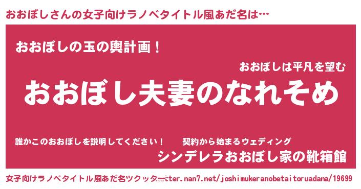 | 男性向けラノベタイトル風あだ名 | 『おまえをオタクにしてやるから、俺をおおぼしにしてくれ! 』 |