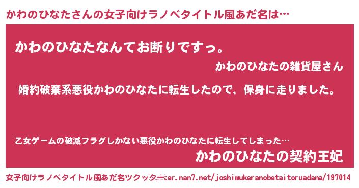 | 男性向けラノベタイトル風あだ名 | 『カワノヒナタスレイヤー』 |