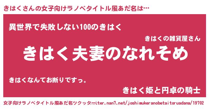 | 男性向けラノベタイトル風あだ名 | 『おまえをオタクにしてやるから、俺をきはくにしてくれ! 』 |